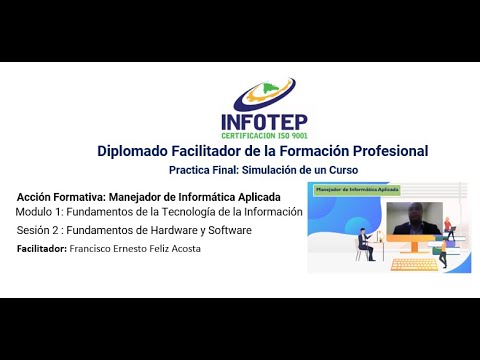 Practica Final: Simulación de un Curso Acción Formativa: Manejador de Informática Aplicada Modulo 1: Fundamentos de la Tecnología de la Información Sesión 2 : Fundamentos de Hardware y Software Facilitador: Francisco Ernesto Feliz Acosta =================================================== Encuadre del curso ================================================== Bienvenida Contacto Introducción Dinámica de Presentación Objetivo General Ejecución del Programa Evaluación Diagnóstica (Conocimientos Previos) Expectativas Normas de Convivencias Beneficios Evaluación Reflexión ------------------------------------------------------------------------------------------------------- Inicio de Sesión ----------------------------------------------------------------------------------------------------- Retroalimentación (Feedback) de la Sesión 1 Tema de Hoy: Sesión 2- Fundamento del Hardware y Software Objetivo Especifico ----------------------------------------------------------------------------------------------------- Detalle de la Sesión (Desarrollo) ---------------------------------------------------------------------------------------------------- Concepto del Hardware Hardware Interno y Externo Hardware de Entrada y Salida Hardware de Almacenamiento Concepto del Software Software de Sistema Software de Programación Software de Aplicación Dudas, Preguntas, Comentarios? Pruebas Práctica (En Grupo) https://docs.google.com/forms/d/e/1FAIpQLScq-564CYZRxrCzx3A9-0YTV2stu9gcferIMD1QmcPve9Bztg/viewform Evaluación individual https://docs.google.com/forms/d/e/1FAIpQLScP-rY6L468pe1fHFxhGUIXBDOB9k1QbpC1FyqSjylIK4rCSg/viewform Proceso del Cierre de la Sesión Síntesis De Los Temas Tratados Hoy Logros Alcanzados Próximo Tema (Sesión 3: Concepto de Sistema Operativo) Sesión Cerrada -------------------------------------------------------------------------------------------------- Cierre del Curso ------------------------------------------------------------------------------------------------- Resumen General del Curso Objetivo General del Curso. ¿Se Cumplió? ¿Se Cumplieron sus Expectativas? Se Cumplieron las Normas de Sana Convivencia? Beneficios Obtenido Reflexión Evaluar Facilitador y el Curso https://docs.google.com/forms/d/e/1FAIpQLSfEKRpuh7LrC1QC0nI6kavHmFfUkgFQ5YCAN3ZPQBKeU03Vog/viewform Final Gracias Curso Cerrado Portafolio de Evidencias del Curso: http://franciscofeliz.com/personal/blog-category/portafoliodeevidencias/